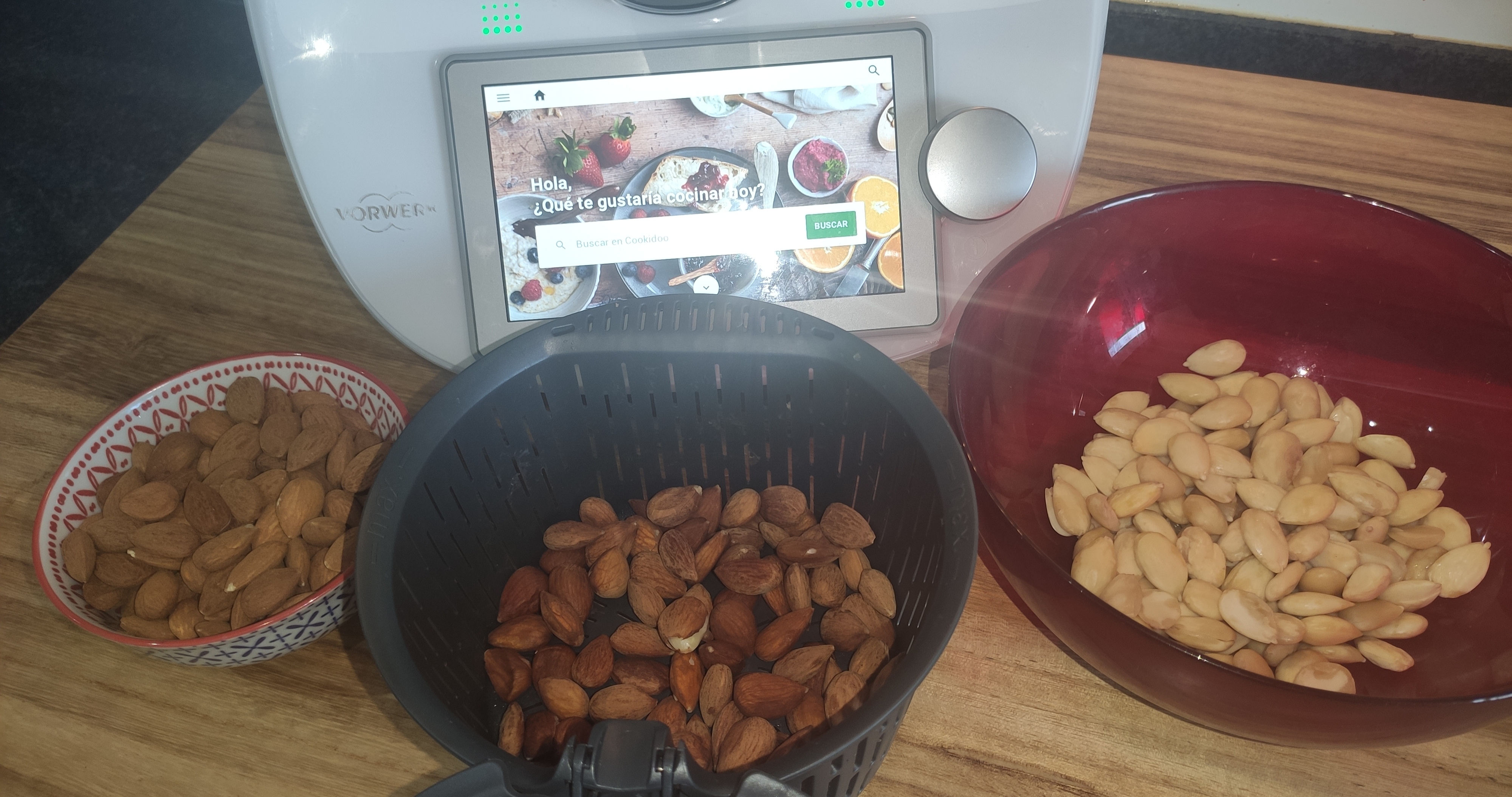 Hecha el agua en el vaso , activa el modo hervidor, cuando el agua esté hirviendo , mete el cestillo con las almendras en el vaso durante 1 minuto. Luego sácalo y deja enfriar las almendras. Su piel se arrugará y se despegará con facilidad.