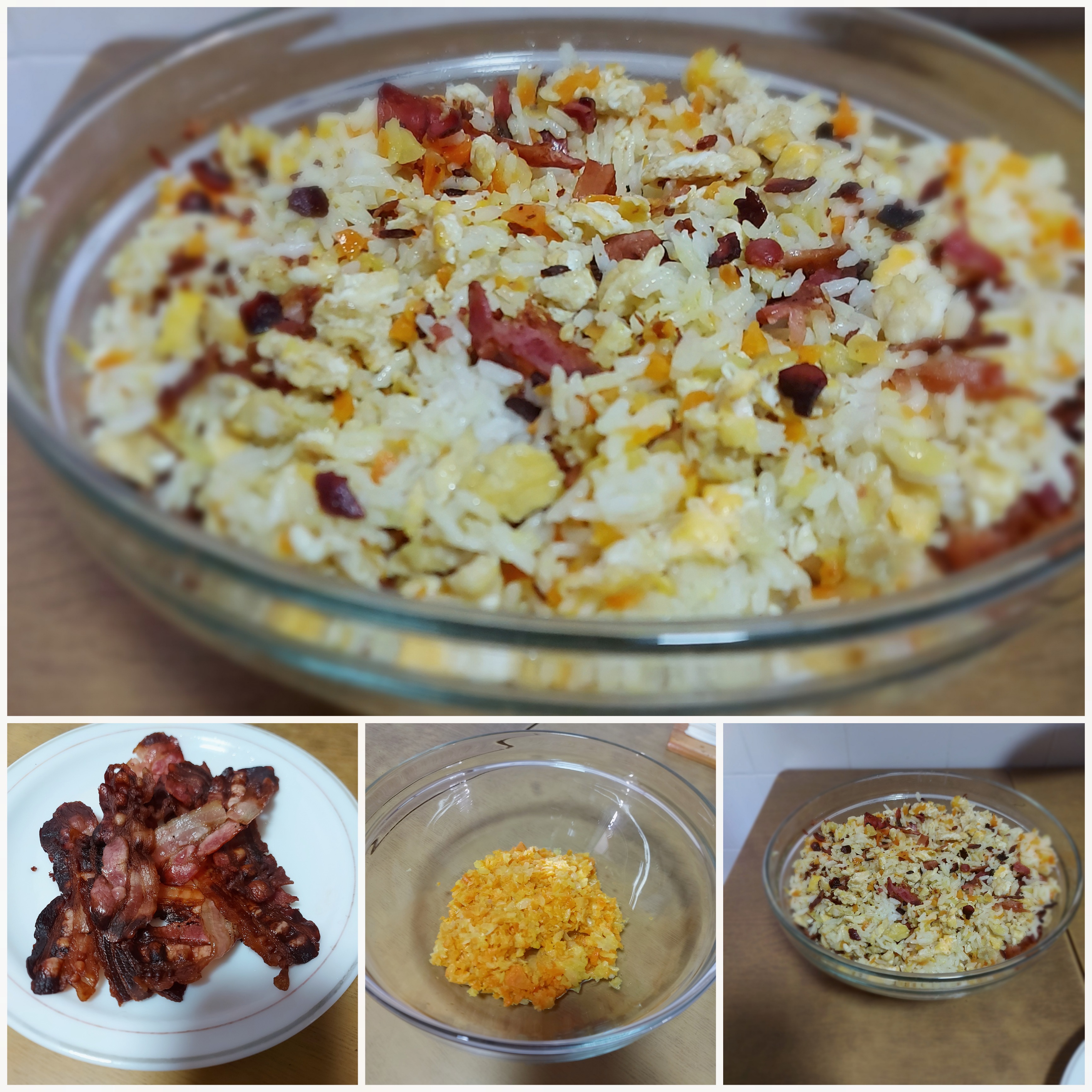 Retire el cestillo y vierta el arroz sobre los ingredientes reservados. Añada el beicon troceado, mezcle suavemente con la espátula y sirva caliente.